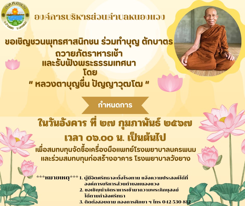 ประชาสัมพันธ์ ขอเชิญชวนพุทธศาสนิกชน ร่วมทำบุญตักบาตรถวายภัตราหารเช้าและรับฟังพระธรรมเทศนา